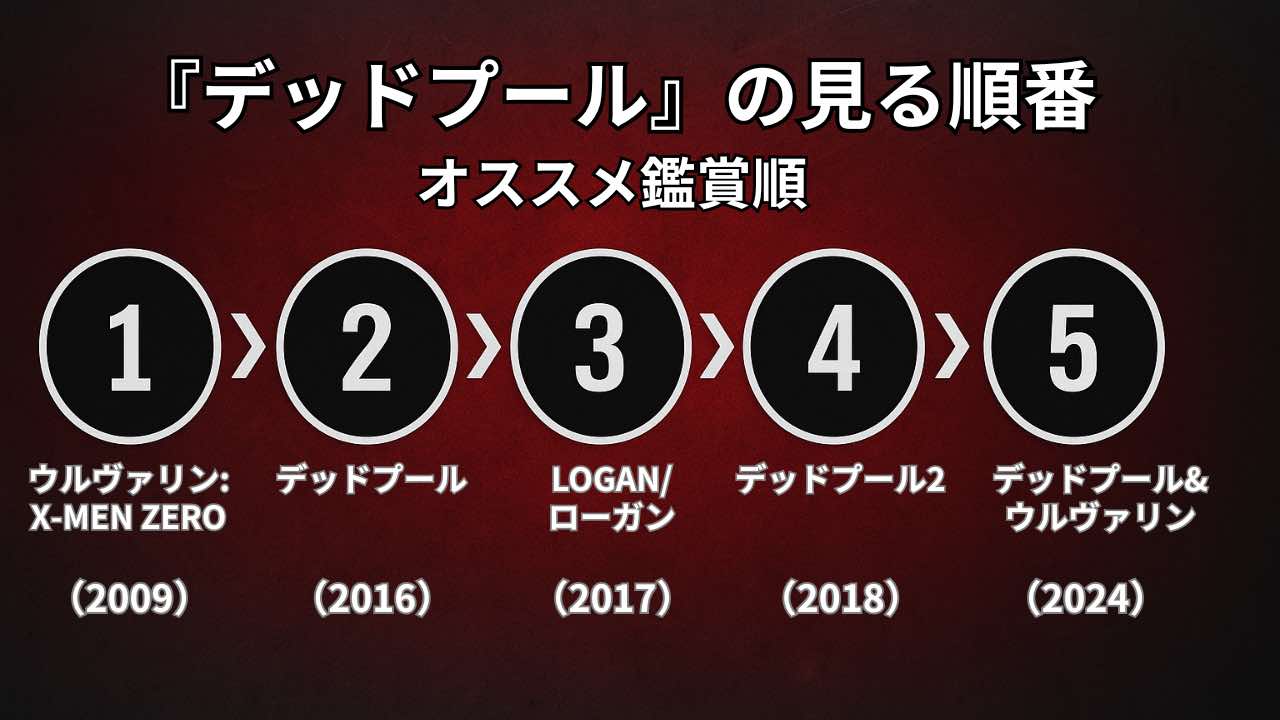 この順番で観ると、デッドプールの背景やX-MENとの関係、そして最新作への流れを無理なく追えます。