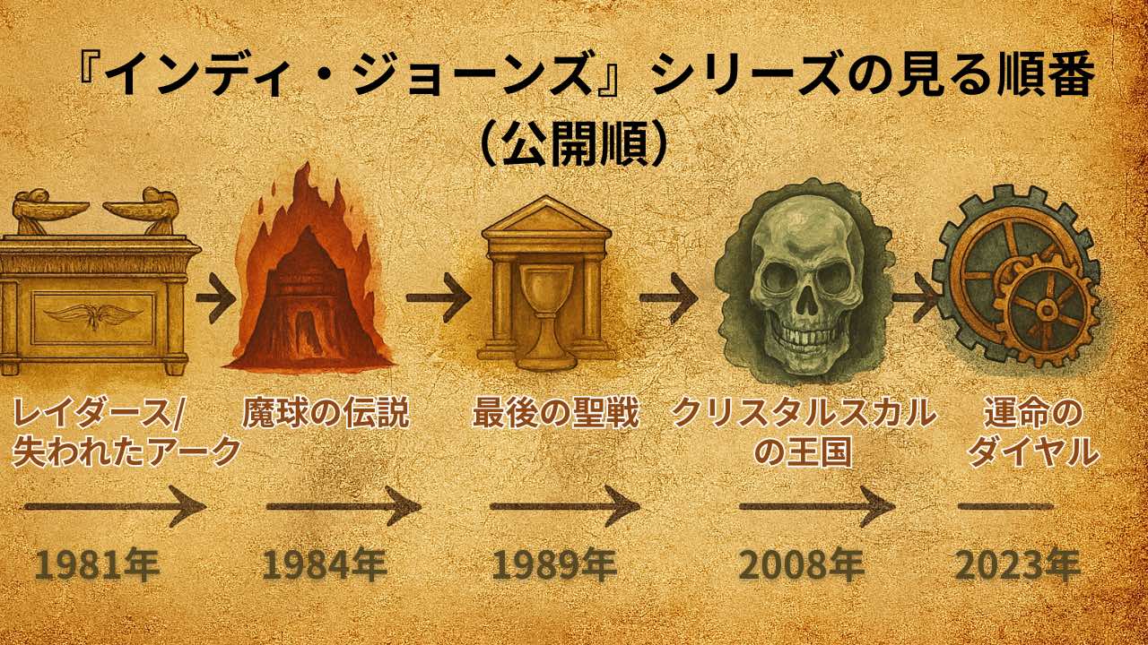 『インディ・ジョーンズ』を見るうえでまず整理しておきたいのが、公開順と時系列順が異なるシリーズであるという点です。